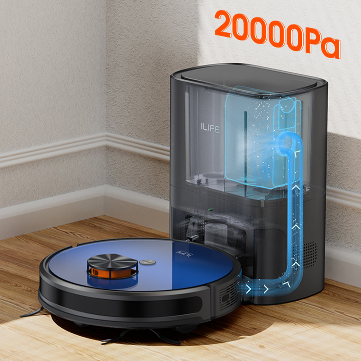 Enjoy effortless cleaning with ILIFE's self-emptying robot vacuum and mop. Its 3.5L dust bag supports up to 70 days of hands-free use. With powerful cyclone technology and 20,000Pa suction, the station empties the dustbin in 20 seconds after each session, preventing clogs for uninterrupted performance.