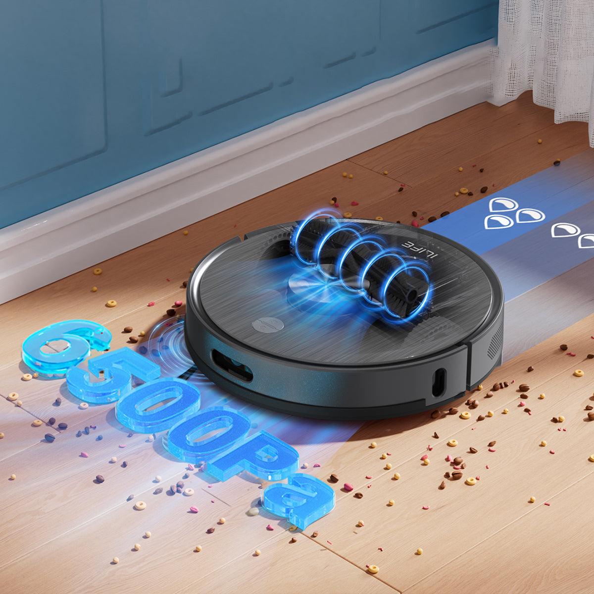 Experience the intense 6500Pa suction power of ILIFE robotic vacuums, designed to tackle deeply embedded dirt and debris from carpets and hard floors alike. With a straight-line vacuuming efficiency of over 90%, it effortlessly handles tough messes, ensuring a thorough and spotless clean every time.