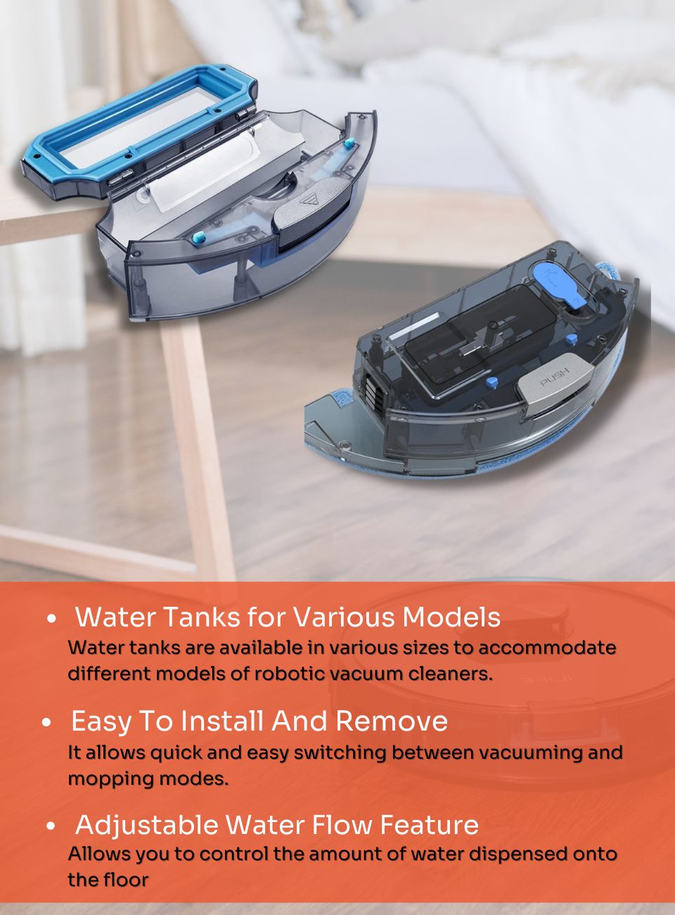 The water tank is typically made of durable materials and has a good capacity which is sufficient for cleaning large areas. It is designed to be easy to fill and attach to the vacuum cleaner and can be easily removed for cleaning and maintenance.