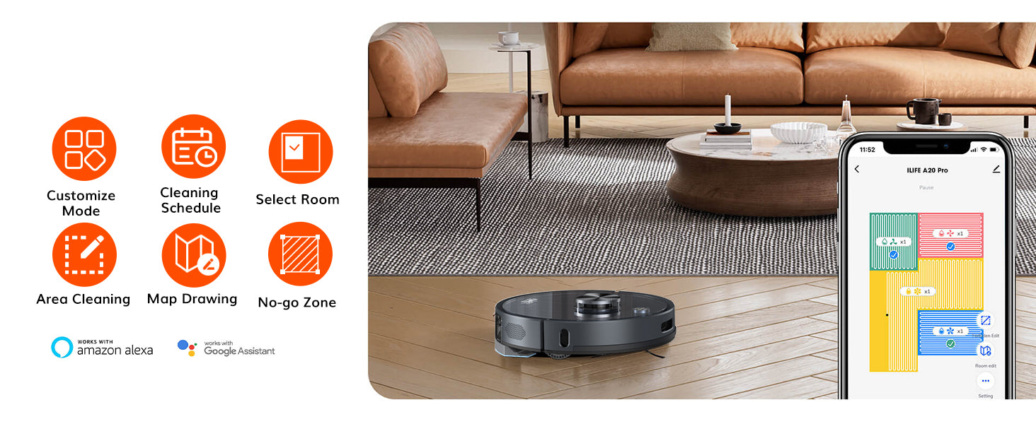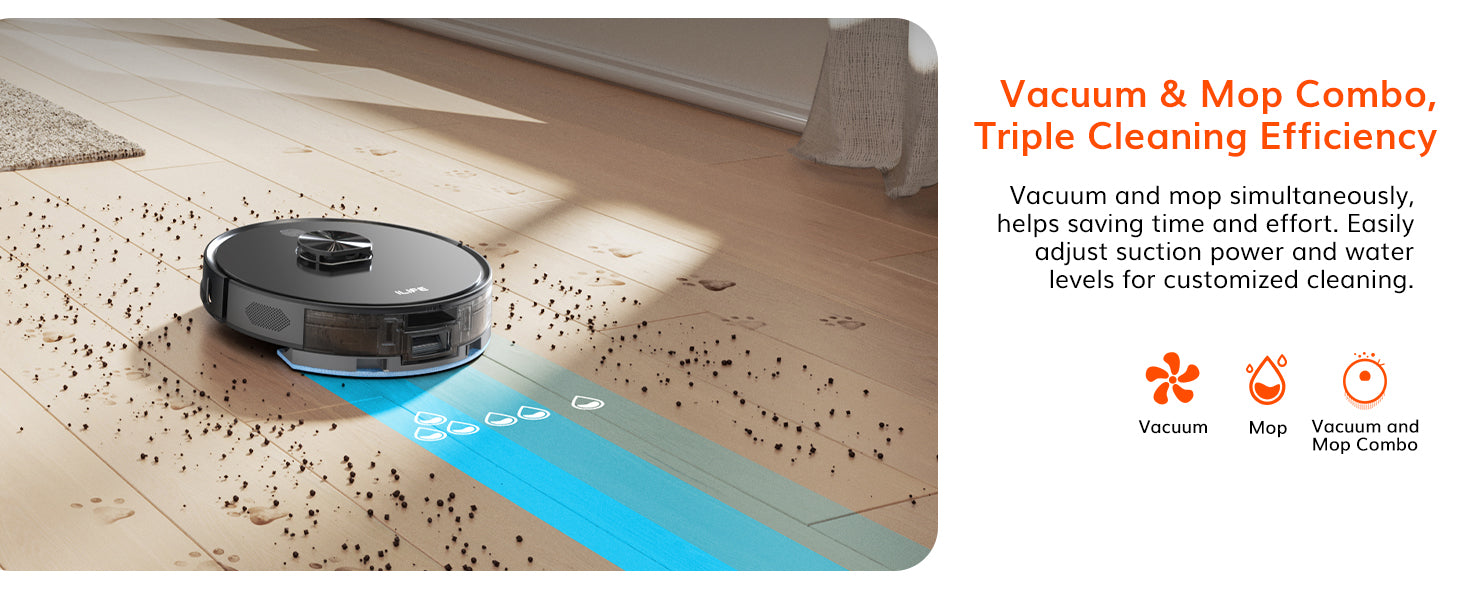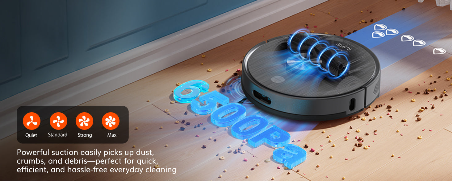 ILIFE A20 Pro is a smart, high-performance robotic vacuum designed for modern home cleaning. It offers simultaneous vacuuming and mopping through an advanced hybrid tank system, ensuring deep, efficient cleaning on all floor types. With 6500Pa suction power, intelligent carpet pressurization, and a 2-in-1 rolling brush, it tackles dirt with ease. Its 5200mAh battery delivers up to 260 minutes of runtime for uninterrupted cleaning. Features like breakpoint resume, app control, and voice assistant compatibility provide real-time management and a personalized cleaning experience. Sleek, powerful, and intuitive, the A20 Pro is built to simplify your daily cleaning routine