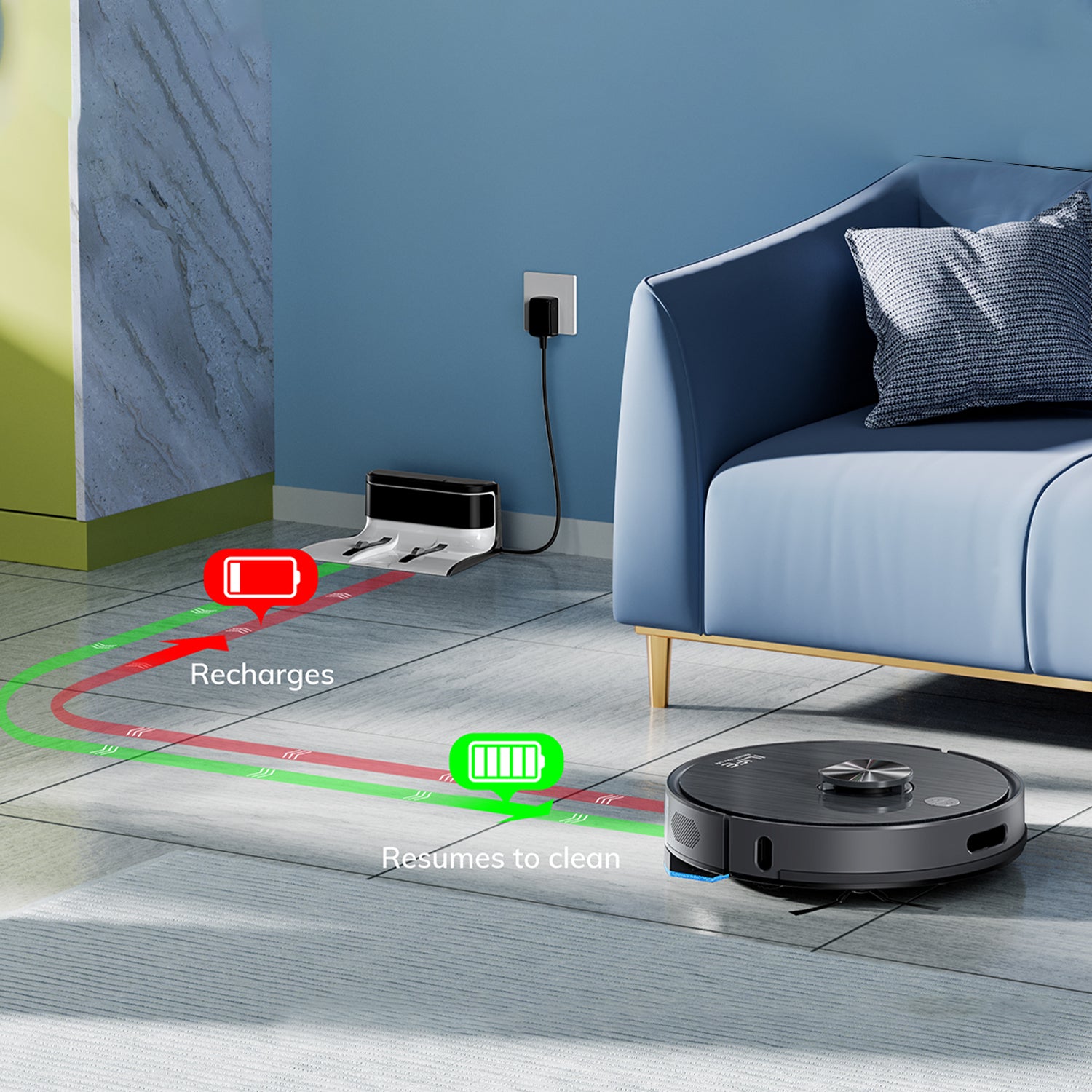 Returns to charging when the battery is low, then resumes cleaning where it stopped.