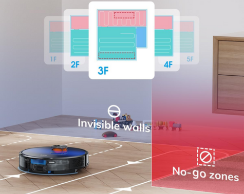 The No Go zones and invisible walls features are especially useful for larger homes with multiple rooms or areas that require different levels of cleaning or attention. It allows you to draw virtual boundaries on the map of your home that the robot vacuum cleaner will not cross. This can be useful if you have fragile items, sensitive areas or rooms with valuable possessions.