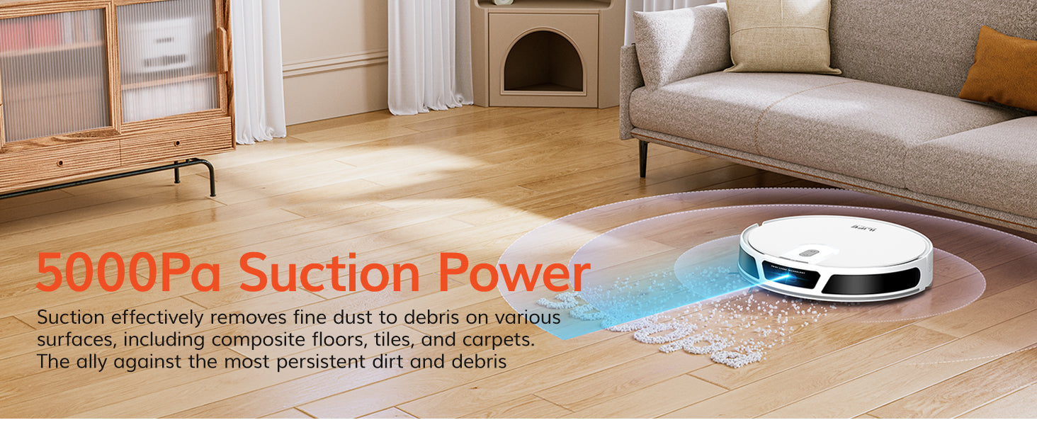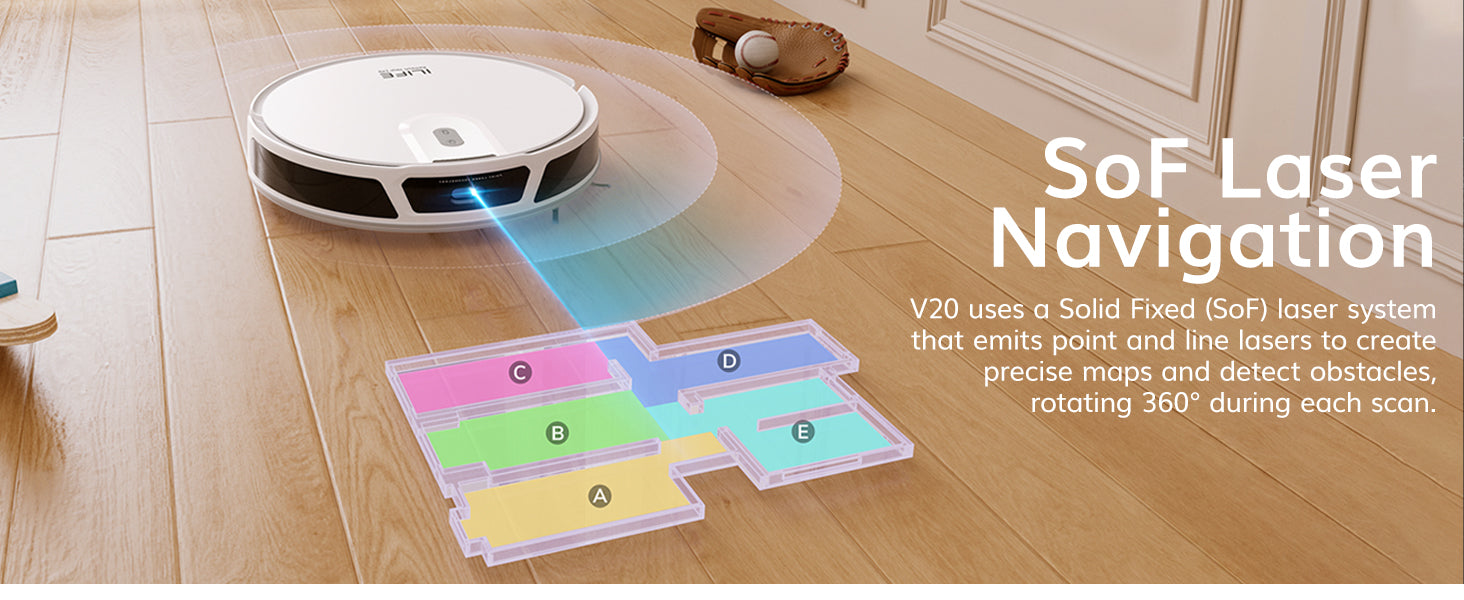 V20 Robot Vacuum features 5000Pa suction, 2-in-1 vacuuming and mopping, and smart SoF Laser Navigation. Control it via app, voice assistant, or remote. With no-go zones, auto carpet boost, and smart mapping, it ensures powerful, customized cleaning on all floor types. The perfect vacuum cleaner for effortless home cleaning